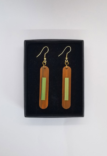 Boucles d'oreilles en bois recouvertes en marquèterie de paille de couleur marron, forme rectangulaire avec couleur verte.