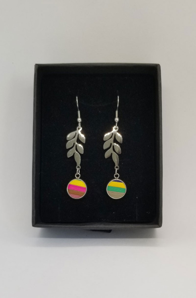 Boucles d'oreilles en acier inoxydable, forme feuille, avec cabochon recouvert de marquèterie de paille de couleur multicolore.