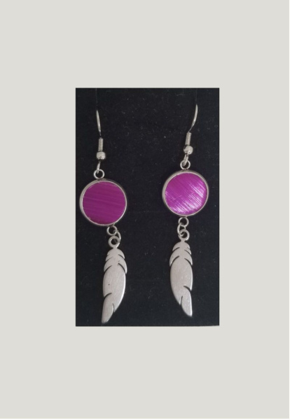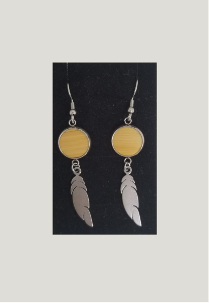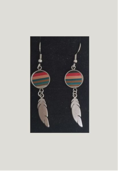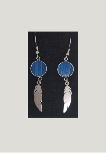 Boucles d'oreilles en acier inoxydable, forme Plume, avec cabochon recouvert de marquèterie de paille de différentes couleurs