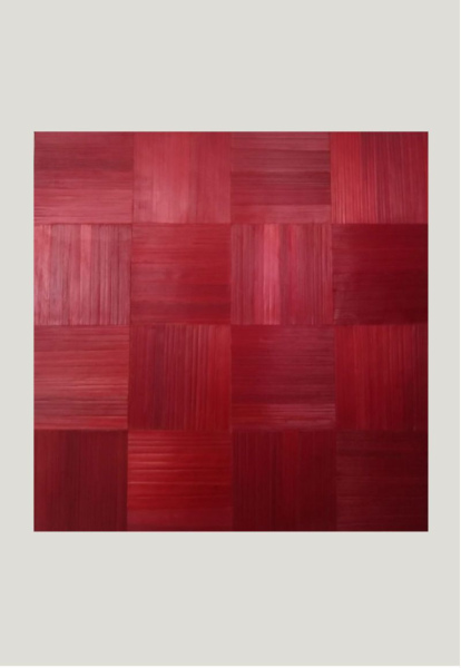 Pailles rouges collées horizontalement et verticalement pour former un damier. Les bords du tableau sont également recouverts de paille de même couleur.