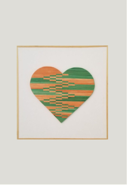 Marquèterie de paille réalisée entièrement à la main, collage sur support carton, découpé au cutter. Le cœur est lui-même collé sur du carton.