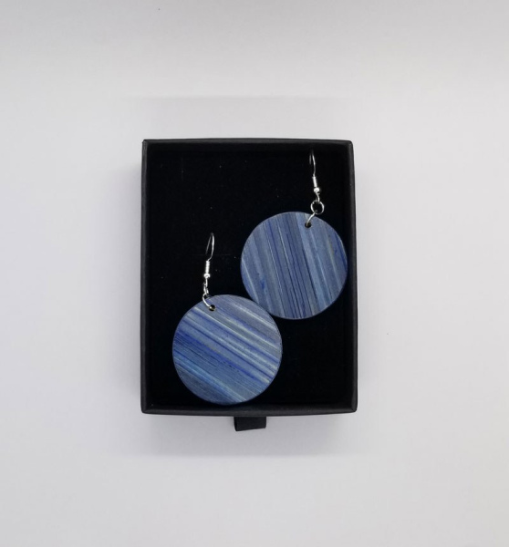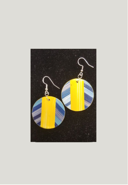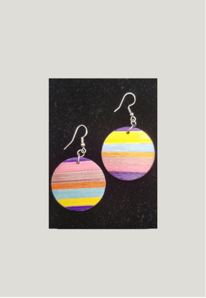 Boucles d'oreilles en bois recouvertes en marquèterie de paille de toutes les couleurs, forme ronde.