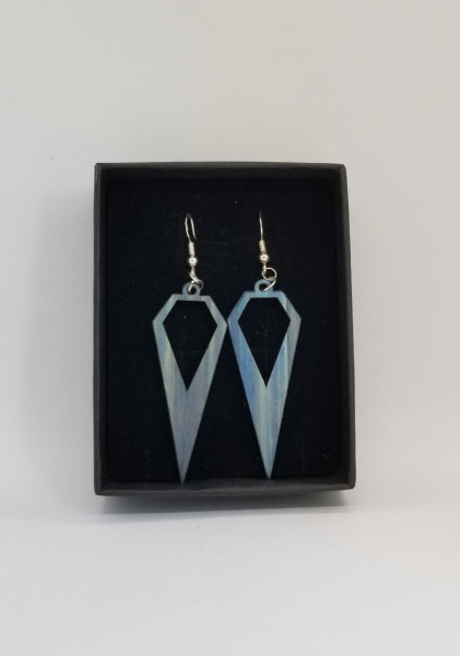 Boucles d'oreilles en bois recouvertes en marquèterie de paille de couleur bleue jeans, forme triangle.
