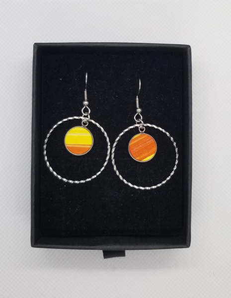 Boucles d'oreilles en acier inoxydable, forme Grande Créole, avec cabochon recouvert de marquèterie de paille de couleur rouge.